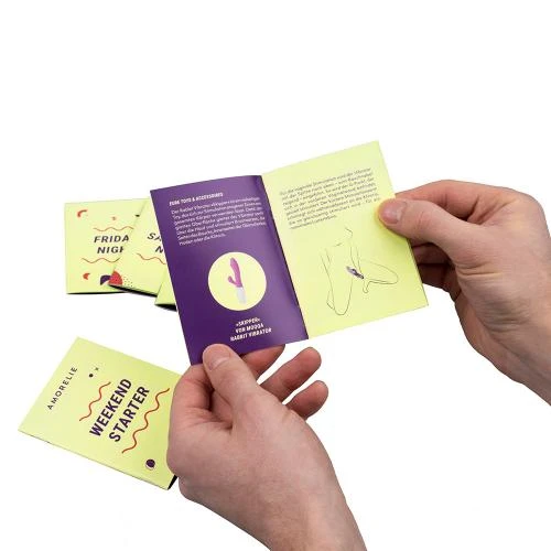 Het is weekend, baby! Open de 5 deurtjes van de AMORELIE “Weekend Lovers” box en laat je verrassen door in totaal 8 speeltjes en accessoires voor een heel weekend. Bij de producten krijg je stimulerende sekstips van onze AMORELIEexperts, die je door 4 thema’s van genot leiden: “Erotische massage”, “Tongspel”, “Avontuur” en “Hoogtepunten”.