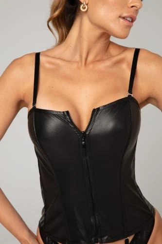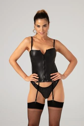 Merk: Christine le Duc. Mooi aansluitende bustier of korset met stoere rits. Gemaakt van imitatieleer aan de voorkant en fijn netmateriaal aan de achterkant. Met afneembare schouder en jarretelbandjes. Incl. sexy string. Met 8 baleinen voor een mooie, aansluitende pasvorm.