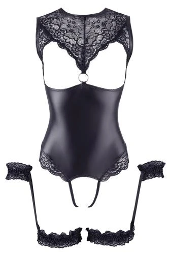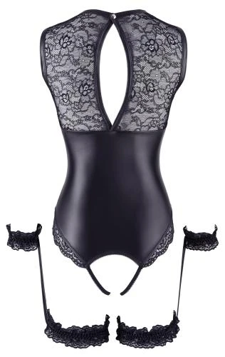 Een waanzinnig coole combinatie van wetlook en kant is deze body. Met open cups en kruis voor je stoutste avonturen. Met de body komt een set kousebandjes waaraan kanten softboeien bevestigd zijn voor als je into een soft SM spelletje bent…. Spannend en uitdagend.