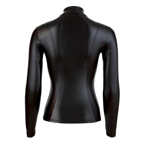 Een stoer wetlook shirt met lange mouwen. Wetlook kleding zorgt voor een uitdagende look en is perfect om te dragen in de slaapkamer of tijdens sexy feestjes. Het shirt heeft een sterke, zilverkleurige rits in het midden waarmee je zelf bepaalt hoe diep je decolleté is. Wetlook is zacht en rekbaar voor een mooie pasvorm en optimaal comfort.