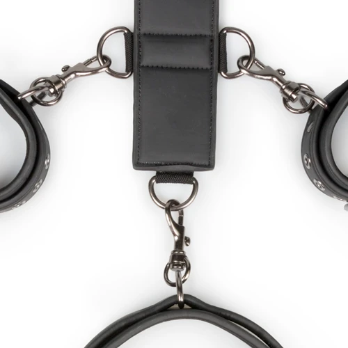Laat jouw ondergeschikte maar zien wie de baas is met deze bondage set. De set bestaat uit een strapon harnas, handboeien en een halsband. Zowel de boeien als de halsband zijn gemakkelijk verstelbaar voor een perfecte pasvorm. Het stevige kunstleer is gevoerd met schuimrubber om schrammen te voorkomen en het zorgt ervoor dat het comfortabel in het gebruik is. De bondage strap heeft negen kleine dringen en één grote dring. De handboeien en de halsband hebben aangehechte clipsluitingen zodat je ze makkelijk aan het harnas kan bevestigen. Door de lengte van de strap en de vele dringen, kan je je eigen bondagespel creëren en kan je deze set op welke manier dan ook gebruiken.