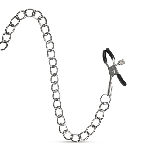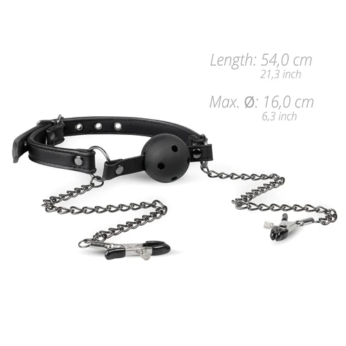 Ga op zoek naar het extreme met deze ballgag met tepelklemmen uit de EasyToys Fetish Collection. Deze zwarte ballgag is gemaakt van glad plastic. De bal is geur en smaakloos en heeft luchtgaten. Hierdoor krijgt de drager voldoende lucht terwijl spreken onmogelijk wordt. De kunstleren band die achter het hoofd wordt gedragen is verstelbaar voor een perfecte pasvorm. Hieraan zitten de metalen tepelklemmen met kettingen. Ook de klemmen zijn verstelbaar voor een wisselende sensatie.