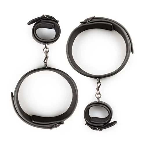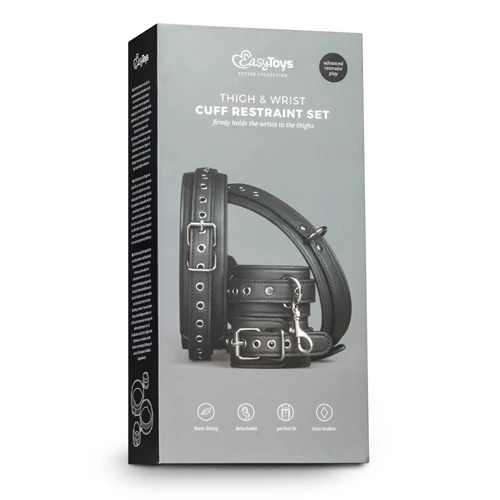 Met deze speciale set kan je de handen van je onderdaan vastbinden aan zijn of haar bovenbenen. Op deze manier heb je complete controle voor een plezierige BDSM ervaring. De boeien zijn gemaakt van sterk en duurzaam kunstleer en zijn gevoerd met schuimrubber om schrammen te voorkomen. De handboeien zijn bevestigd met clipsluitingen aan de boeien voor het bovenbeen. Dit betekent dat je de boeien ook kan losmaken en ze los van elkaar kan gebruiken of in combinatie met andere BDSM speeltjes. Alle vier de boeien zijn gemakkelijk verstelbaar voor een perfecte pasvorm en comfortabel gebruik.