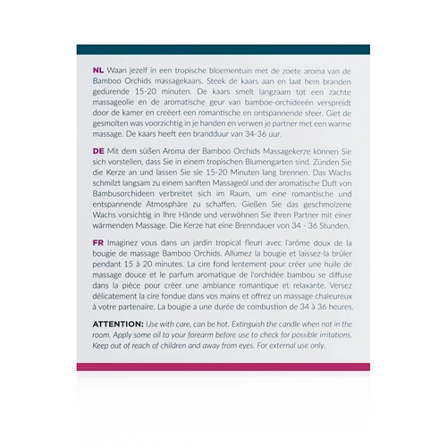 Laat je masseren of masseer je partner met deze Exotiq massagekaars. Steek de kaars aan en geniet van de heerlijke bamboe orchideeëngeur die zich door de kamer verspreidt.