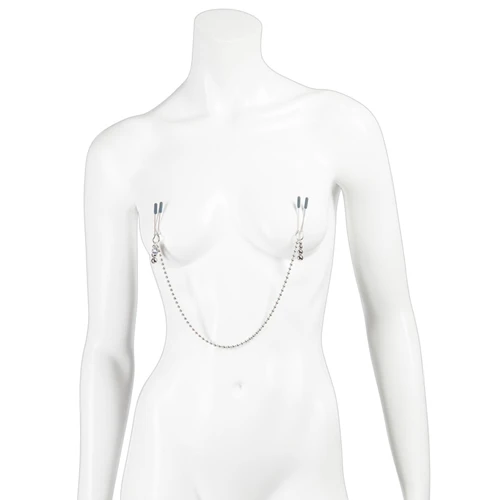 Deze zilverkleurige tepelklemmen uit de Fifty Shades collectie zorgen voor een knijpende, trekkende sensatie op de tepels. De tweezer klemmen zijn verstelbaar en voorzien van zachte topjes voor optimaal comfort. Ook zorgen de siliconen topjes ervoor dat de klemmen niet afglijden. De klemmen worden verbonden door een metalen ketting waaraan de partner zachtjes kan trekken voor extra sensatie.