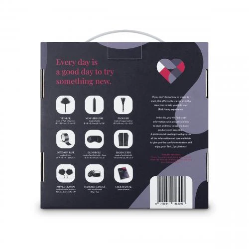 In de box vind je veel moois om elkaar te teasen en te verwennen. Geef elkaar een ontspannende massage met de heerlijk ruikende massagekaars. Blinddoek en boei jouw partner met het satijnen oogmasker en linten. Gebruik de flogger voor een plagerige tik op de billen. Prikkel de huid met de veren kietelaar. Ontdek hoeveel intensiteit jij kunt verdragen met de verstelbare tepelklemmen of ontneem iedere poging tot bewegen met het bondage tape. In de set vind je ook een krachtige bullet vibrator voor een heerlijke stimulatie op al jullie favoriete plekjes. De uitgebreide en eerlijk geschreven handleiding (Engelstalig) is tot stand gekomen in samenwerking met een ervaren seksuloog en staat boordevol uitleg, do’s en dont’s en maakt jullie zelfverzekerd genoeg om aan deze nieuwe ontdekkingstocht te beginnen!