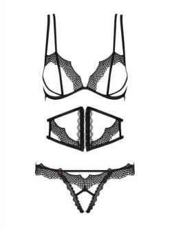 Deze Bravelle 3delige set is onderdeel van een pikante serie met prachtige details. De set bestaat uit een BH met open cups en verstelbare bandjes, een sexy taillegordel en een bijpassende string met open kruisje. Deze set heeft een opvallend design en is gemaakt van zacht rekbaar materiaal voor een mooie pasvorm.