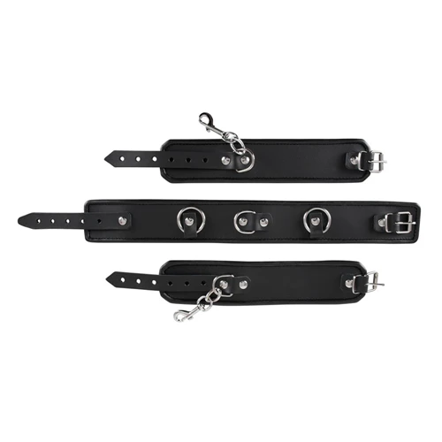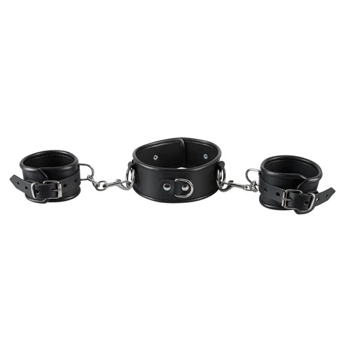 Leren handboeien set bestaande uit een halsband en twee handboeien van leer. De handboeien kunnen bevestigd worden aan de halsband met behulp van een karabijn haak aan de boeien. De nek boei heeft ook haken aan de zijkant en een Dvormige ring aan de voorkant. De randen van de handboeien zijn omgezoomd. Beperk de bewegingsvrijheid van jouw partner of sub met deze halsband met handboeien!